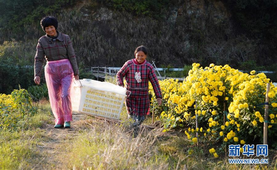 11月8日,婺源縣思口鎮(zhèn)農(nóng)戶(hù)在運(yùn)送采摘的皇菊。新華社記者 胡晨歡 攝