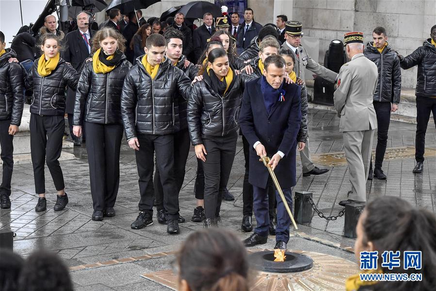 11月11日,在法國巴黎,法國總統(tǒng)馬克龍在紀(jì)念儀式上撥旺無名烈士墓的火焰。當(dāng)日,法國政府在巴黎凱旋門前舉行儀式,隆重紀(jì)念第一次世界大戰(zhàn)結(jié)束一百周年。新華社記者 陳益宸 攝