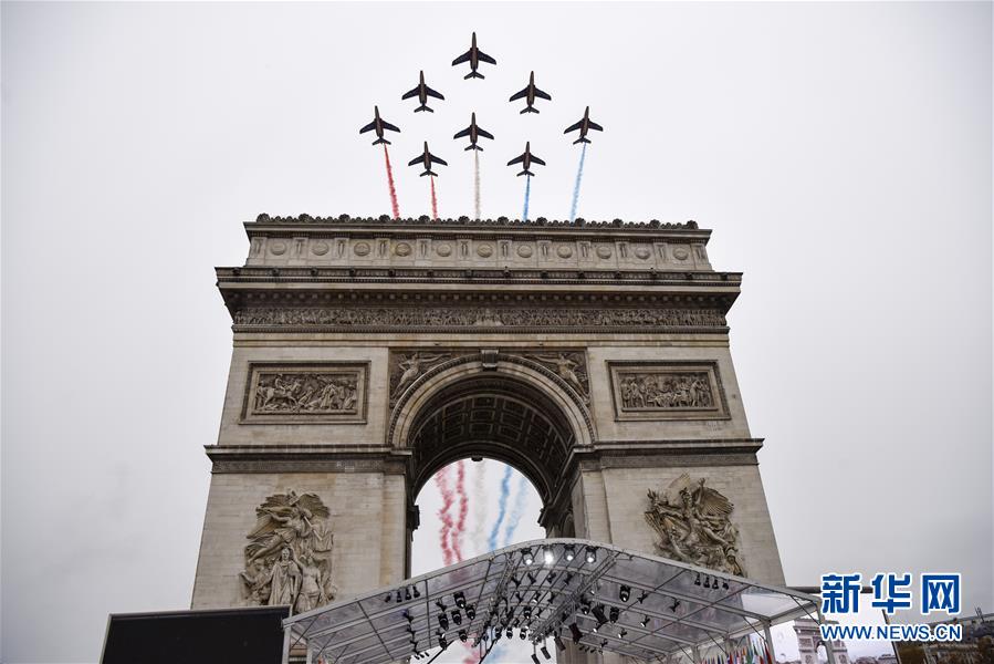 11月11日,在法國巴黎,“法蘭西巡邏兵”飛行表演隊在紀念儀式上飛過凱旋門。當日,法國政府在巴黎凱旋門前舉行儀式,隆重紀念第一次世界大戰(zhàn)結束一百周年。新華社記者 陳益宸 攝