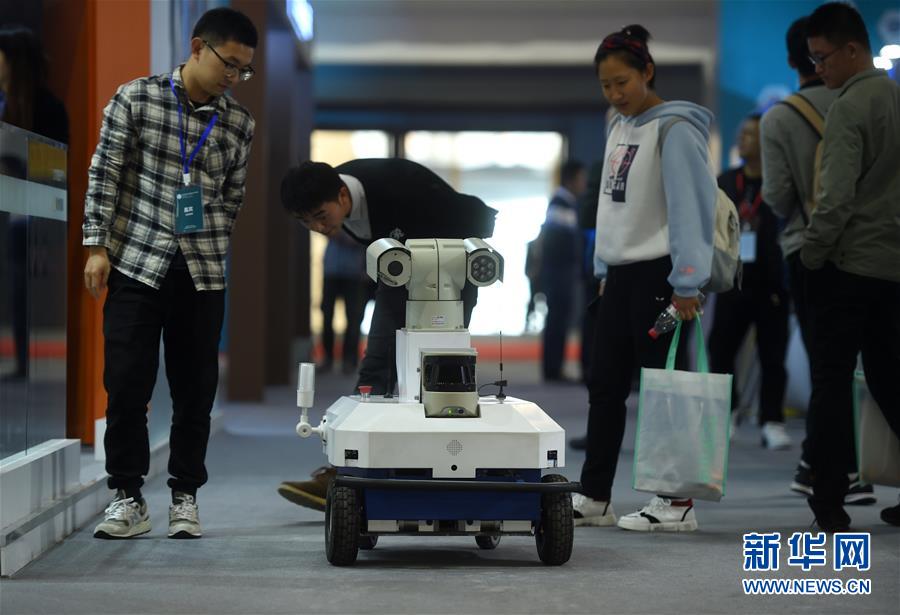 11月10日,人們?cè)谡箷?huì)現(xiàn)場觀看展出的一款電力巡檢機(jī)器人。