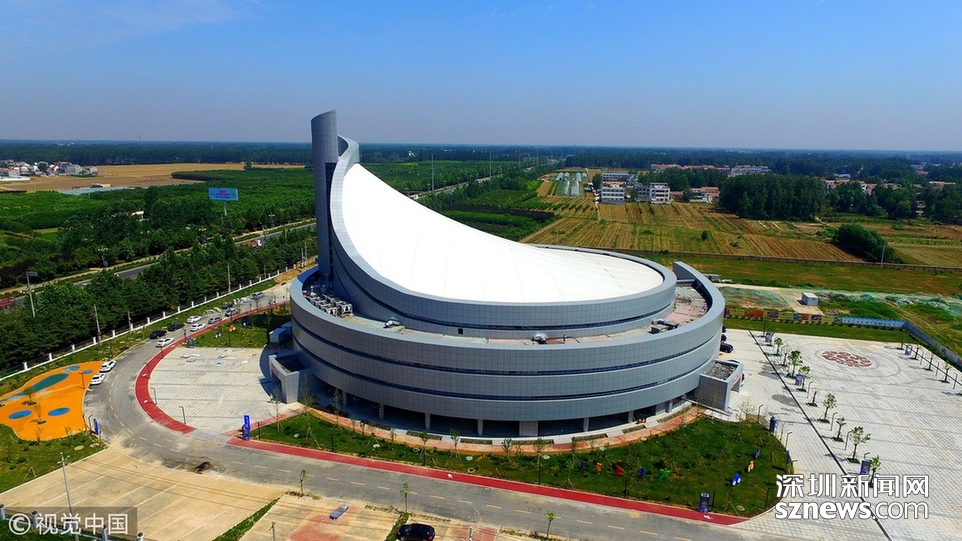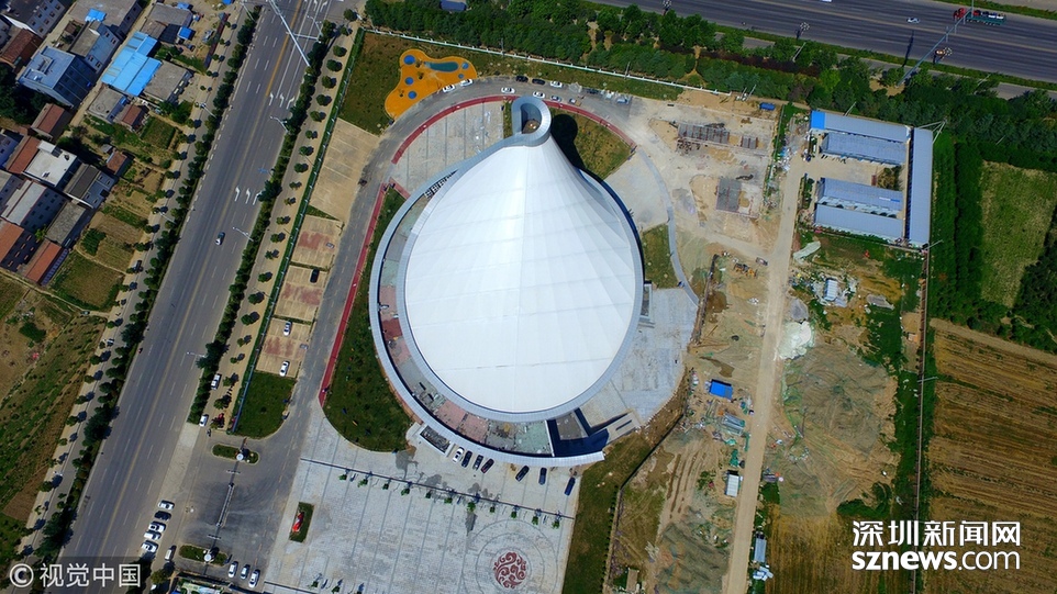 2018年6月13日,航拍河南淮陽一座即將竣工落成的體育場館建筑,市民稱酷似一個(gè)石磨盤。