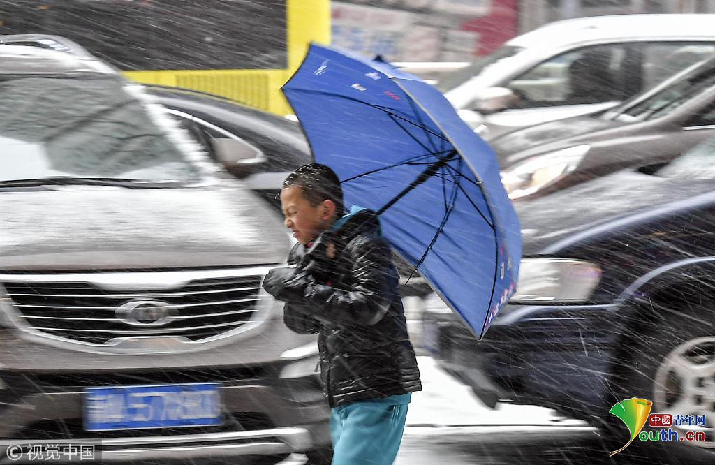 2018年11月12日,持續(xù)濃霧天氣的新疆烏魯木齊市,又迎來一場雨雪天氣,氣溫隨之驟降。圖為一名男孩打著雨傘與風(fēng)雪“抗?fàn)帯薄D片作者:劉新