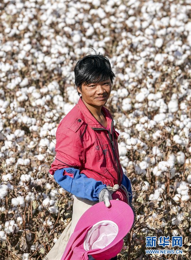 拾花工陳喜波在新疆巴楚縣多來提巴格鄉(xiāng)卡扎尼塔皮提村的棉田中(10月25日攝)。