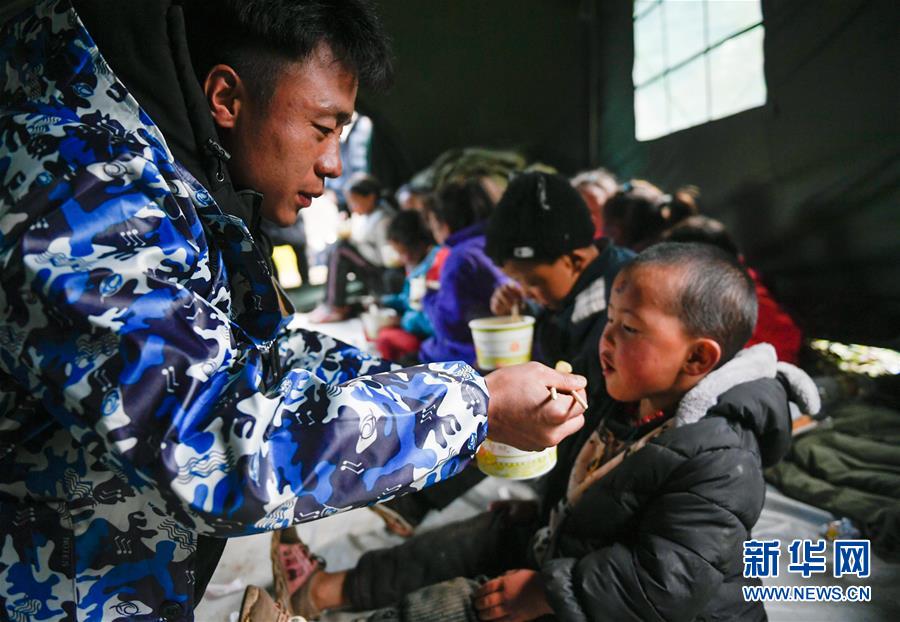 波羅鄉(xiāng)一名工作人員在臨時過渡安置點帳篷內(nèi)給一名兒童喂飯(10月14日攝)。 新華社記者 劉東君 攝