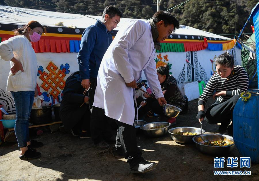 11月12日,在西藏昌都市江達縣波羅鄉(xiāng)康扎西安置點,工作人員在臨時廚房打飯。 西藏自治區(qū)江達縣波羅鄉(xiāng)康扎西安置點,離波羅鄉(xiāng)政府直線距離約3公里,位于一處地勢開闊平緩的山谷中,比堰塞湖水面高出100多米。10月11日金沙江白格段山體滑坡發(fā)生后,當?shù)鼐驮谶@里設立了安置點,安置附近受災群眾。 新華社記者 劉東君 攝