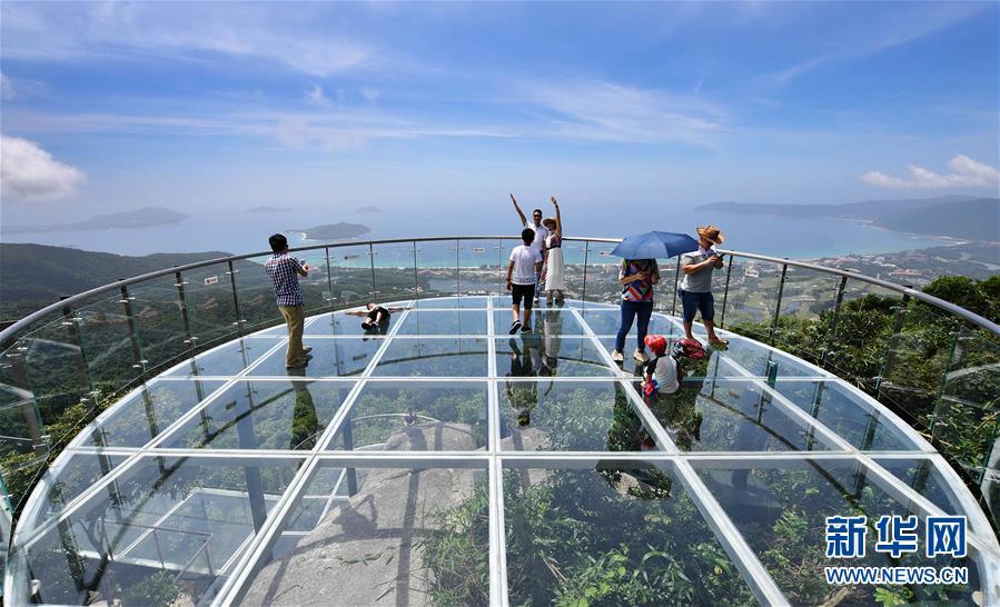 8月31日,游客在玻璃觀景平臺上參觀游覽。近日,位于海南省三亞市亞龍灣熱帶天堂森林公園的大佛石全海景玻璃棧道開始正式營業(yè)。凌空而建的玻璃棧道全長400米,游客可將亞龍灣的美景盡收眼底。新華社記者郭程攝