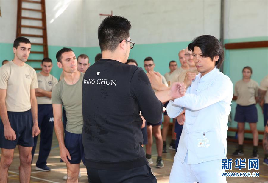 11月13日,在馬耳他首都瓦萊塔,鄭祖杰(前右)向馬耳他士兵展示詠春拳。 當日,中國國家級非物質(zhì)文化遺產(chǎn)詠春拳代表性傳承人鄭祖杰走進馬耳他武裝部隊,向官兵展示詠春拳。這一活動是馬耳他中國文化中心與馬耳他武術協(xié)會合辦的詠春拳系列展示活動之一。 新華社記者 袁韻 攝