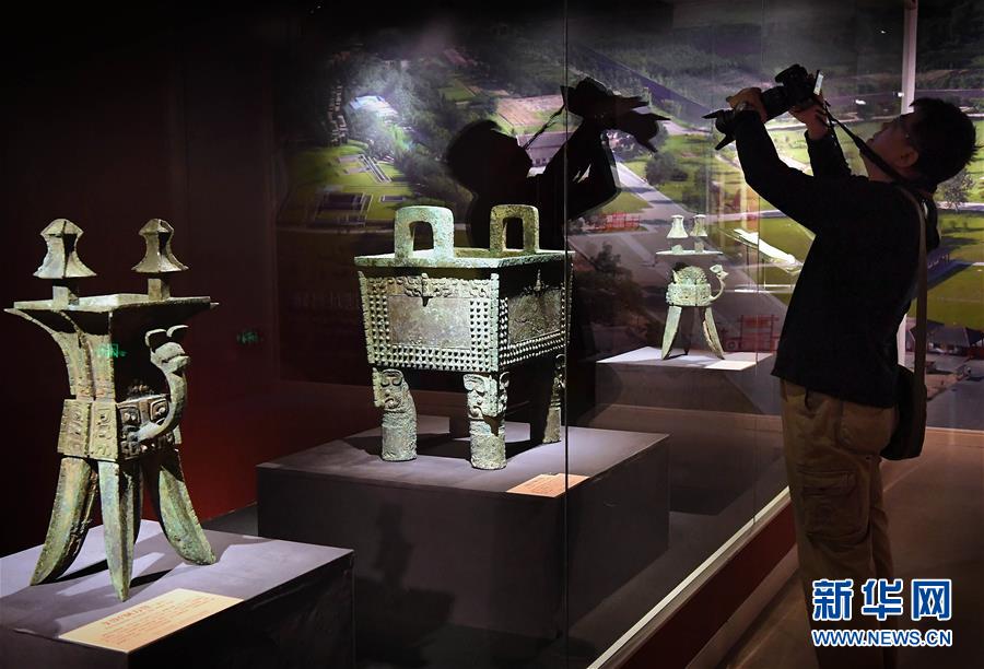 10月12日,參觀者在安陽博物館拍攝展品。目前,“鳳歸大邑商——殷墟婦好文物安陽故里展”正在安陽博物館展出,共展出文物474件。1976年被考古學家發(fā)現(xiàn)的婦好墓,是世界文化遺產、中國商代后期都城遺址——殷墟唯一保存完整的商代王室墓葬。新華社記者李安攝