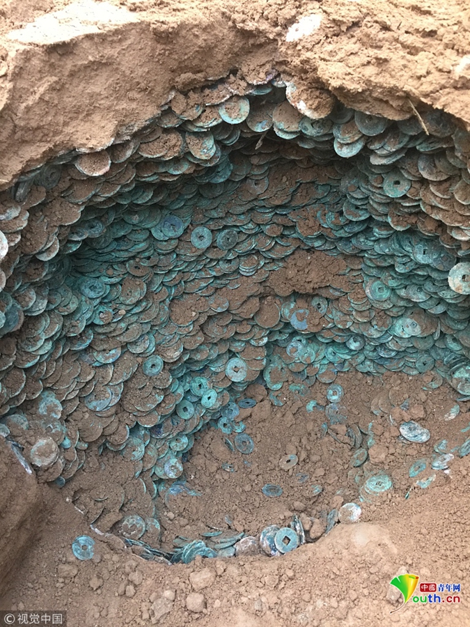 11月9 日中午11 時許,該縣縣城一工地在對地面開挖施工時,發(fā)現(xiàn)地下埋藏有大量古幣,立即報警。警方快速趕到現(xiàn)場進行保護。得知這一信息后,市、縣兩級文物部門工作人員立即趕到,并由專業(yè)考古人員進行發(fā)掘。發(fā)掘現(xiàn)場拍攝的照片顯示,這些古幣埋在一個圓形的土坑中。