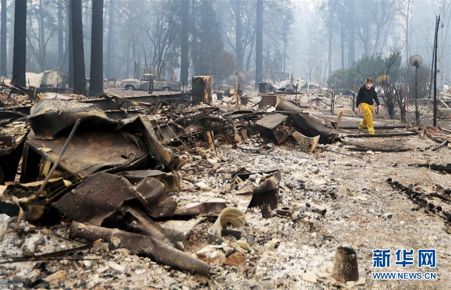 11月13日,在美國(guó)加利福尼亞州天堂鎮(zhèn),搜救人員在山火過(guò)后的廢墟工作。