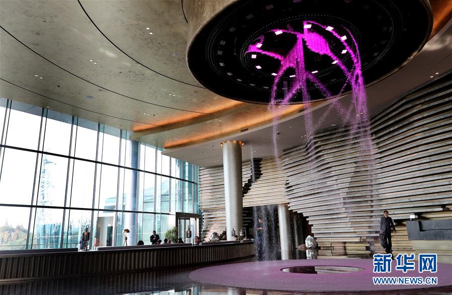 這是世茂洲際酒店大堂內(nèi)的水幕裝置(11月13日攝)。 位于上海松江的世茂洲際酒店11月15日正式開門營業(yè)。這家在一個(gè)廢棄采石礦坑內(nèi)建成的酒店成為上海又一新景。 新華社記者 方喆 攝