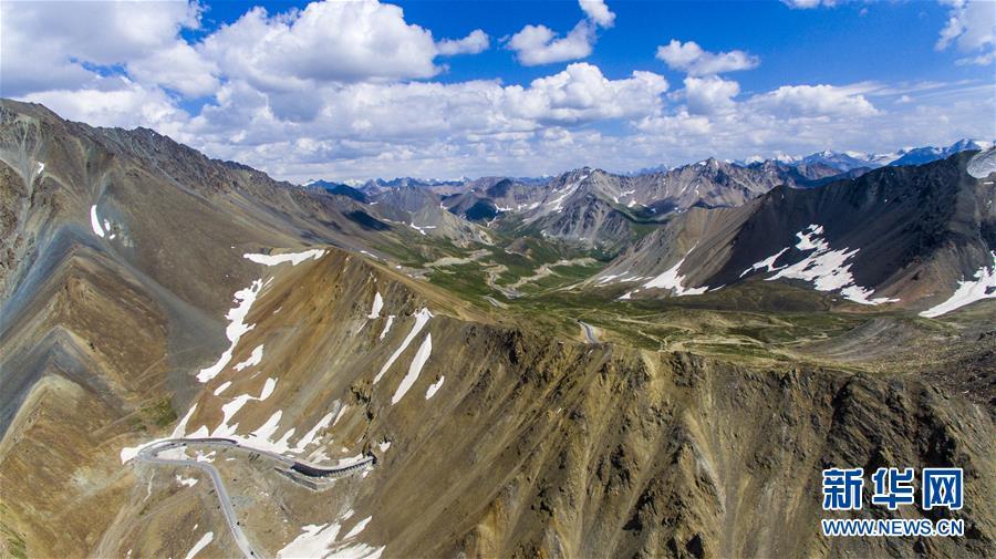 獨庫公路穿越海拔3390米的哈希勒根達坂(2017年7月13日無人機拍攝)。 新華社記者 江文耀 攝