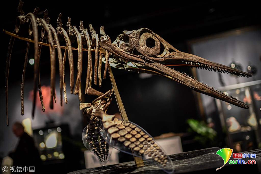 當(dāng)?shù)貢r(shí)間2018年11月19日,法國巴黎,在展出中的1.8億年前侏羅紀(jì)時(shí)期的恐龍骨架,將于11月20日在Drouot拍賣行拍賣。圖片來源:視覺中國