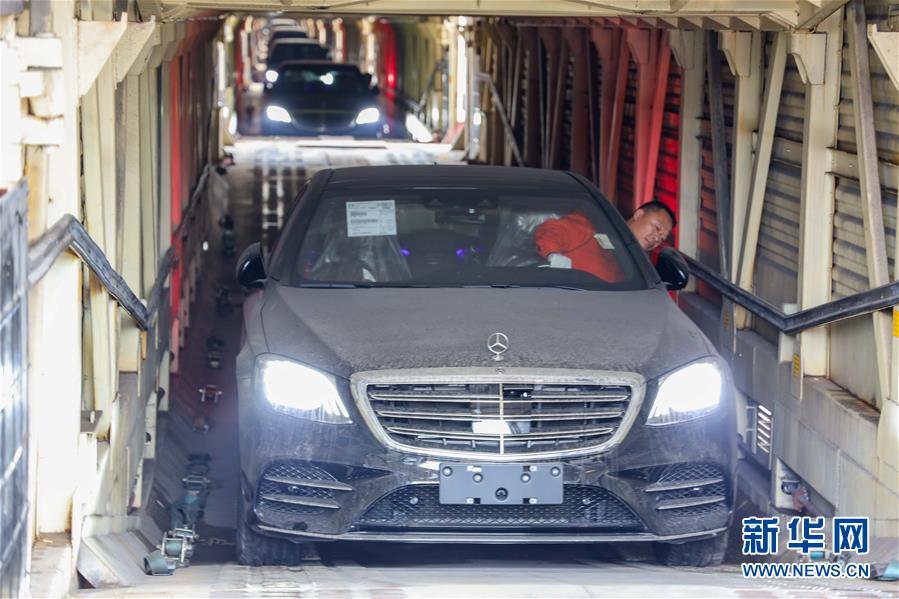 11月19日,在首趟中歐班列商品車專用車運輸國際班列的車廂內,工作人員駕駛著進口整車進行卸貨作業(yè)。 新華社記者 劉潺 攝