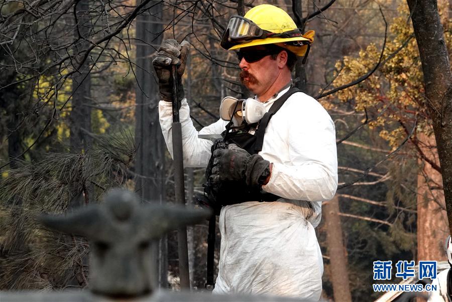 11月19日,在美國(guó)加利福尼亞州比尤特縣天堂鎮(zhèn),救援人員在山火廢墟中工作。新華社記者吳曉凌攝