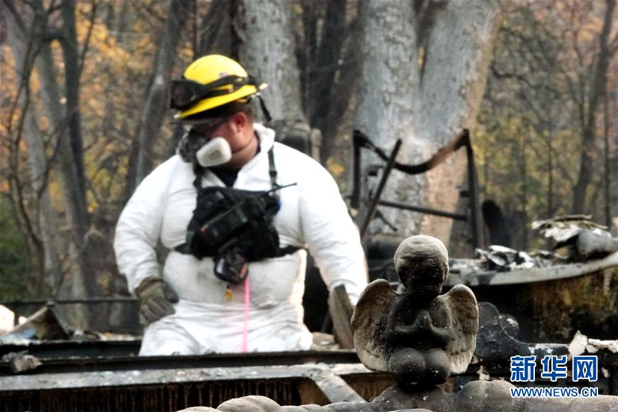 11月19日,在美國(guó)加利福尼亞州比尤特縣天堂鎮(zhèn),救援人員在山火廢墟中工作。新華社記者吳曉凌攝