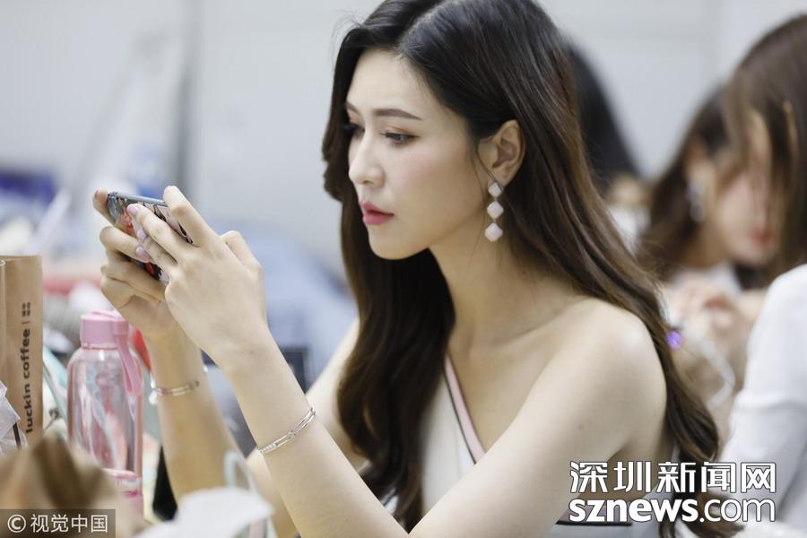 2018年11月16日,廣州,第十六屆中國(廣州)國際汽車展覽會媒體日。模特候場表演間隙,陳宏偉玩手機(jī)游戲