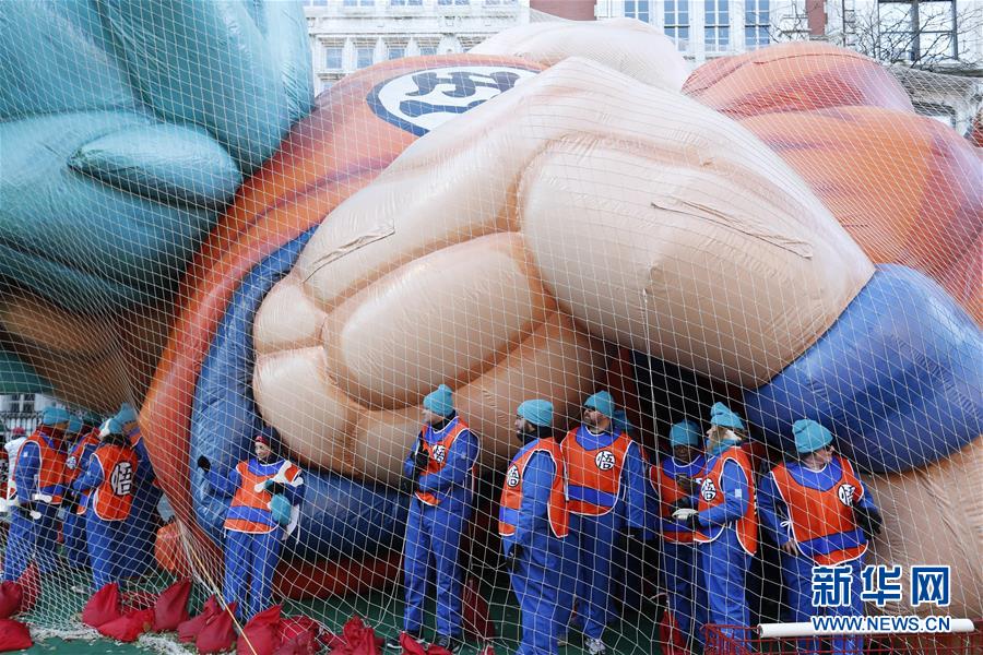 11月22日,在美國(guó)紐約感恩節(jié)大游行開(kāi)始前,氣球操縱人員進(jìn)行準(zhǔn)備工作。