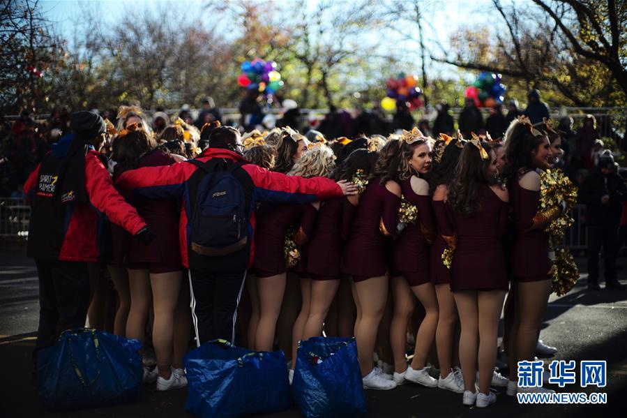 11月22日,在美國(guó)紐約感恩節(jié)大游行開(kāi)始前,演員們抱團(tuán)取暖。