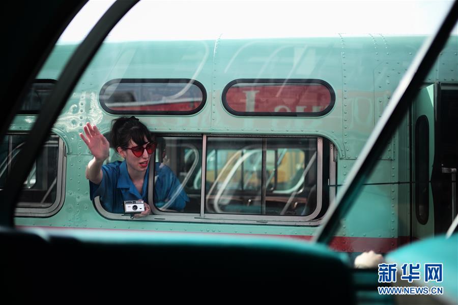 10月7日,在美國(guó)紐約舉行的巴士節(jié)上,一名女子在一輛老巴士上拍照。 新華社記者李木子攝