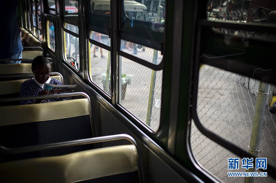 10月7日,在美國(guó)紐約舉行的巴士節(jié)上,一名女子在3100號(hào)巴士上看報(bào)。該車(chē)型是美國(guó)首批配備空調(diào)的巴士車(chē)型之一。 新華社記者李木子攝