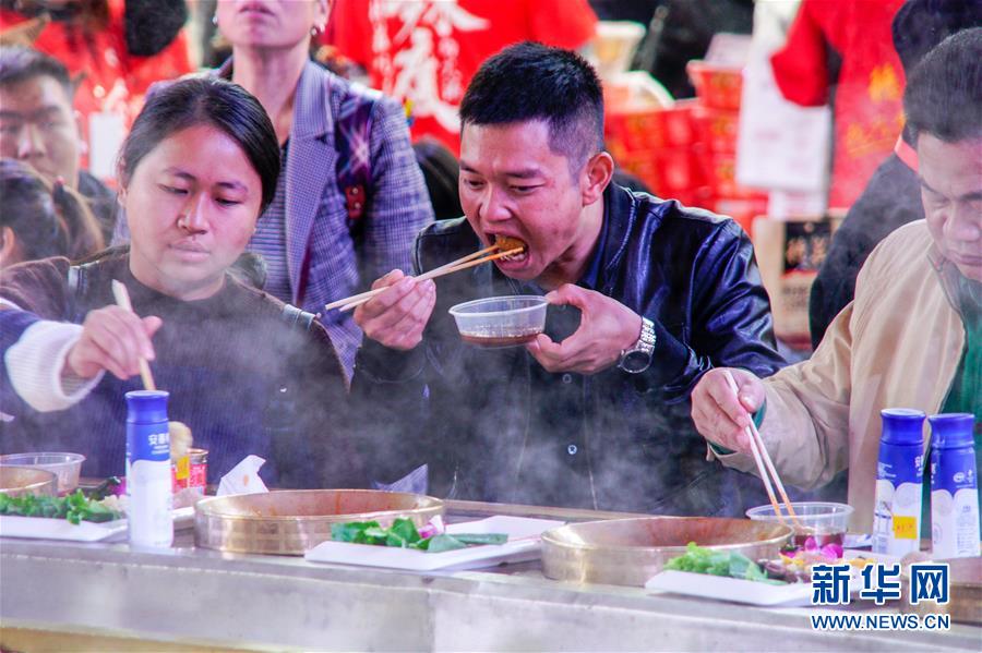 10月19日,食客們圍坐在一口特大火鍋前品嘗。 當(dāng)日,第十屆中國(guó)(重慶)火鍋美食文化節(jié)在重慶市江北區(qū)正式開(kāi)幕。本屆火鍋美食文化節(jié)為期4天,以“麻辣happy城市節(jié)日”為主題,50000平方米的展區(qū)吸引了70余個(gè)火鍋品牌、300余家火鍋供應(yīng)鏈企業(yè)參展,萬(wàn)人同燙火鍋的盛況在“火鍋之都”重慶再現(xiàn)。 新華社記者 劉潺 攝