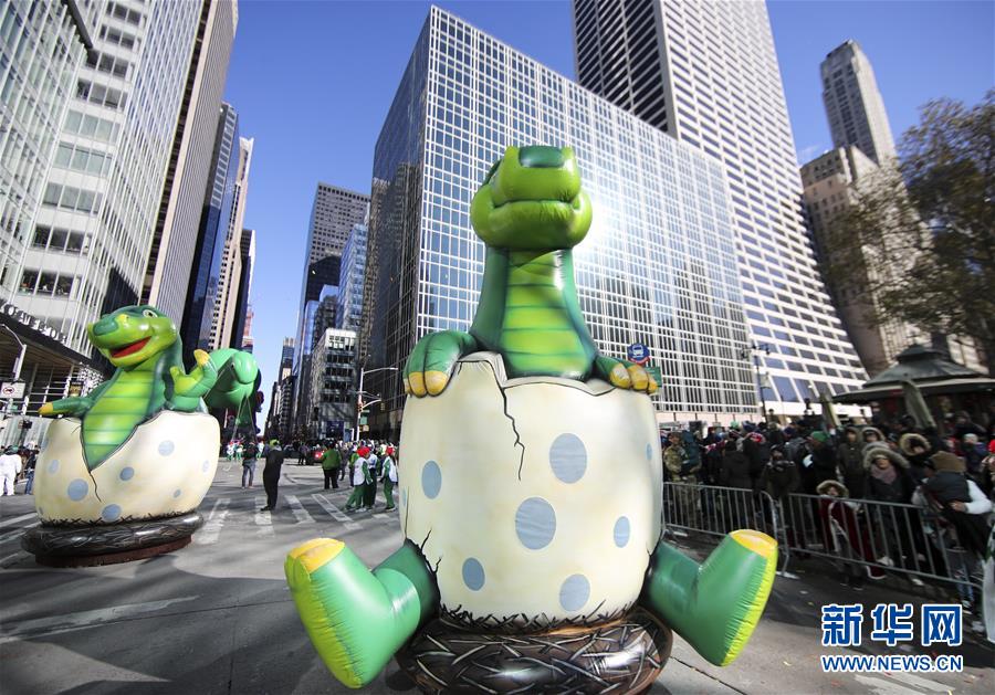 11月22日,在美國(guó)紐約感恩節(jié)大游行上,“恐龍寶寶”造型氣球車(chē)行進(jìn)在曼哈頓街頭。