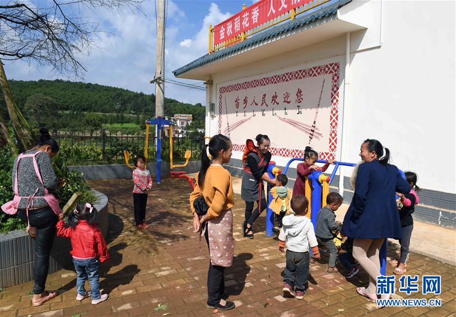 10月6日,在尋甸回族彝族自治縣塘子街道小海村,家長(zhǎng)帶著孩子在村里的休閑健身廣場(chǎng)玩耍。國(guó)慶節(jié)期間,云南省尋甸回族彝族自治縣塘子街道小海村一片喜慶祥和。人們身著節(jié)日盛裝,載歌載舞,歡慶搬入新居后的第一個(gè)國(guó)慶節(jié)。新華社記者楊宗友攝