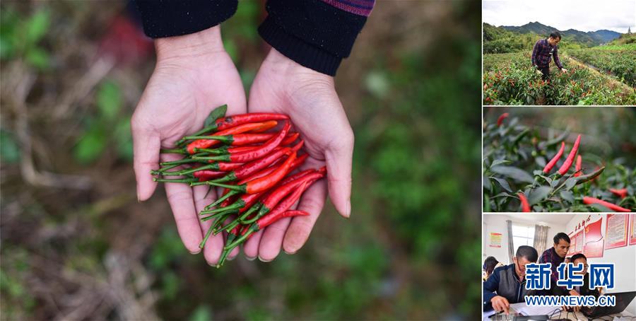 拼版照片:左圖為在大浪鎮(zhèn)大德村,龍德手捧剛剛收獲的辣椒;右上圖為龍德在摘辣椒;右中圖為合作社種植的辣椒;右下圖為龍德(中)在辦公室里工作(照片均攝于11月18日)。龍德是大德村的致富帶頭人,目前合作社種植有400多畝辣椒,帶動(dòng)106戶貧困戶參與。 廣西融水苗族自治縣是國(guó)家扶貧工作重點(diǎn)縣,全縣“九山半水半分田”,生活生產(chǎn)環(huán)境較為惡劣,脫貧攻堅(jiān)任務(wù)艱巨,目前還有7.68萬(wàn)貧困人口。面對(duì)經(jīng)濟(jì)發(fā)展落后、貧困面廣且程度深的現(xiàn)狀,當(dāng)?shù)匕衙撠毠?jiān)與創(chuàng)新產(chǎn)業(yè)扶持相結(jié)合,依托生態(tài)資源優(yōu)勢(shì),實(shí)施“特色產(chǎn)業(yè)富民行動(dòng)”,通過(guò)發(fā)展特色民族旅游、林下經(jīng)濟(jì)和特色養(yǎng)殖業(yè)等扶貧產(chǎn)業(yè),帶動(dòng)貧困群眾依靠勤勞的雙手,拔窮根摘窮帽,實(shí)現(xiàn)脫貧致富。據(jù)了解,目前全縣貧困戶參與特色產(chǎn)業(yè)發(fā)展的有2.9萬(wàn)戶,扶貧產(chǎn)業(yè)覆蓋率達(dá)95%。 新華社記者 黃孝邦 攝