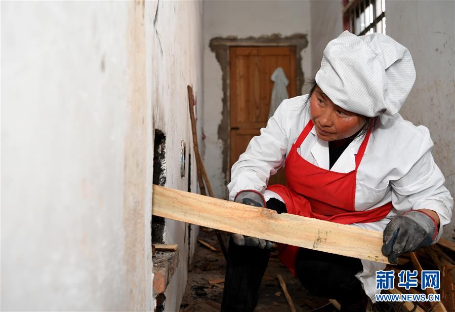 11月22日,姚新花在鍋巴廠里為土灶添柴。新華社記者徐亮攝
