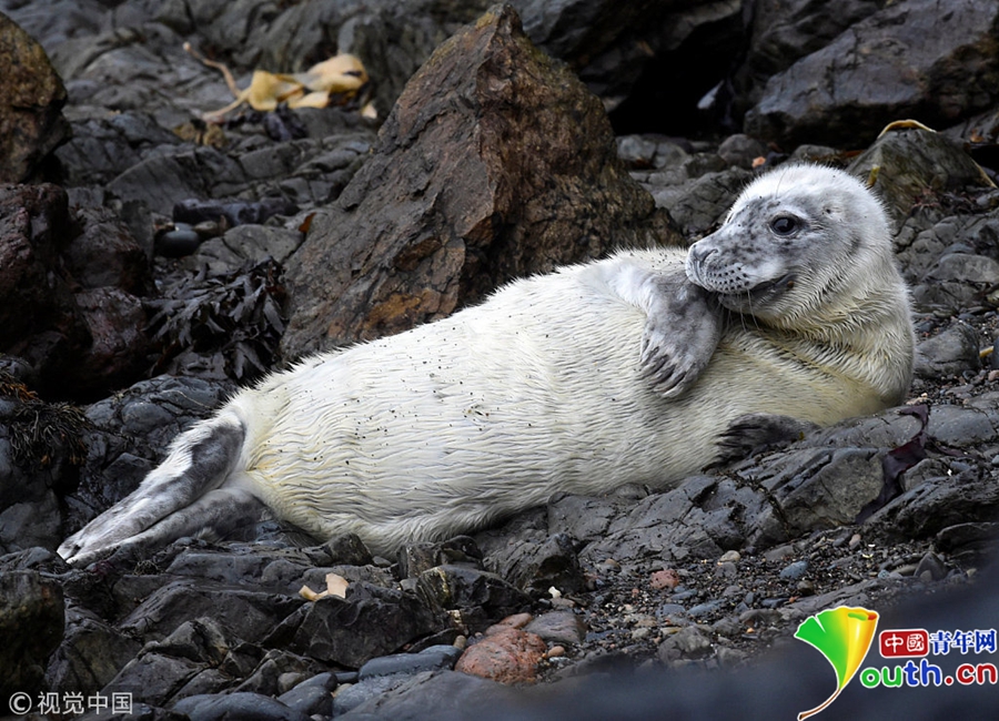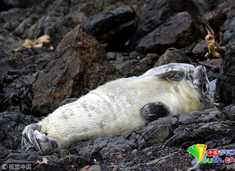 中國青年網(wǎng)北京10月9日電 當(dāng)?shù)貢r(shí)間2018年10月8日,英國彭布羅克郡,一只大西洋海豹幼崽躺在海邊礁石上。海豹幼崽出生時(shí)都有毛茸茸的白色非防水皮毛,它們會在第四周蛻皮。