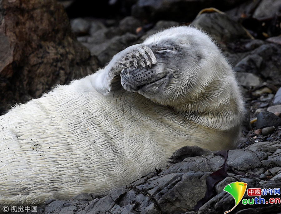 一只大西洋海豹幼崽躺在海邊礁石上,鏡頭前害羞遮臉。