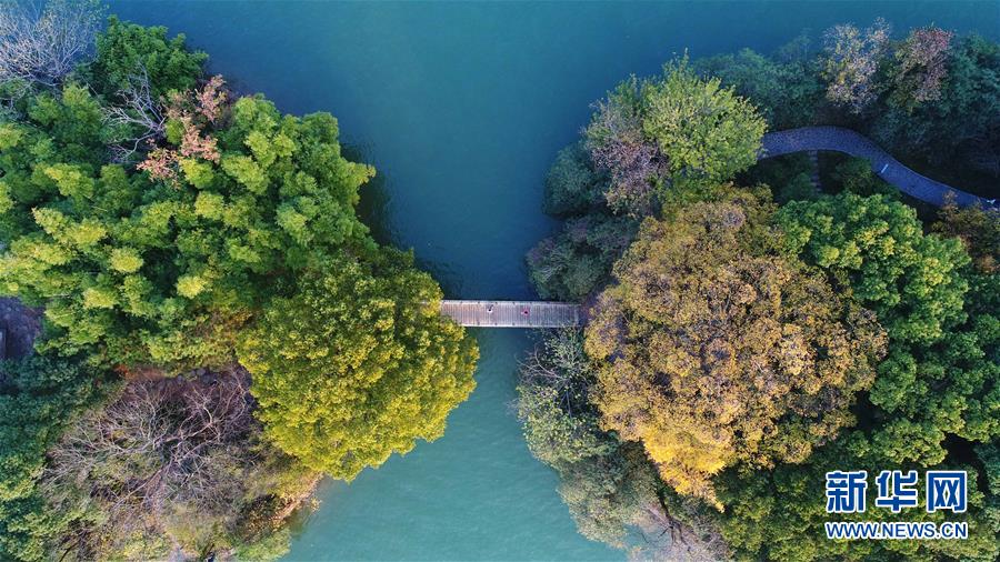 游客通過湖南烈士公園年嘉湖湖面一座小橋(11月25日無人機拍攝)。新華社記者 李尕攝