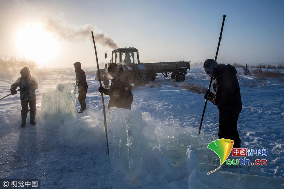當(dāng)?shù)貢r(shí)間2018年11月27日,雅庫茨克,零下41攝氏度左右的氣溫下,村民在當(dāng)?shù)氐囊粋€(gè)湖中采集冰塊。當(dāng)?shù)睾芏嗳艘蕾囉谌诨鶋K解決供水,因?yàn)槎嗄陜鐾粮采w地區(qū)冬季氣溫極低,沒有其他的方式供應(yīng)水。