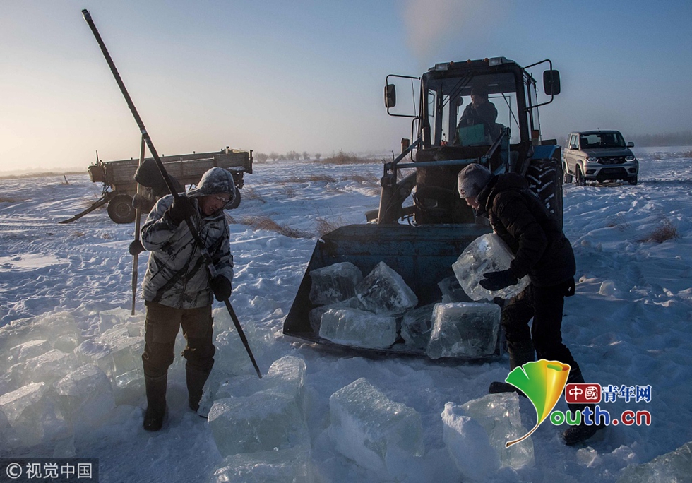 圖為村民將采集上來的冰塊裝車。