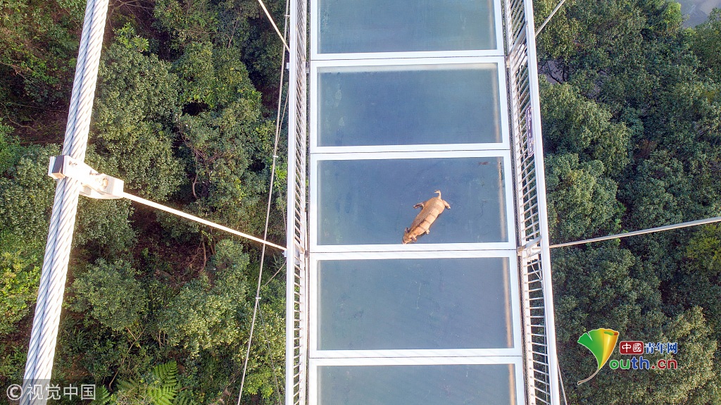 2018年11月29日,一只山豬誤入廣東清遠(yuǎn)古龍峽云天玻霸玻璃橋,結(jié)果被嚇得趴在橋面上發(fā)抖,幾名值班保安齊心協(xié)力將山豬從玻璃橋上解救出來(lái),將其送回森林。