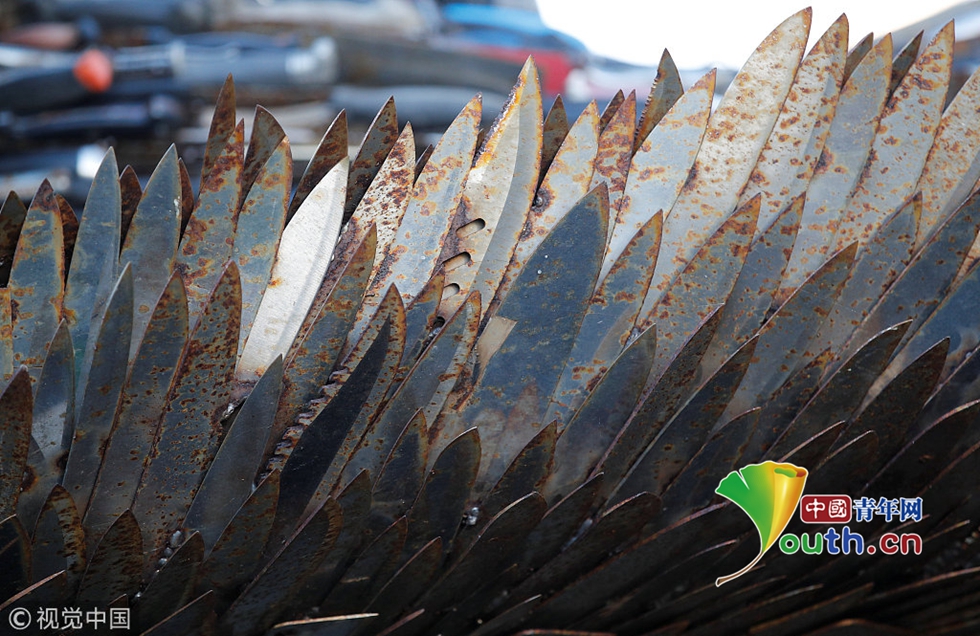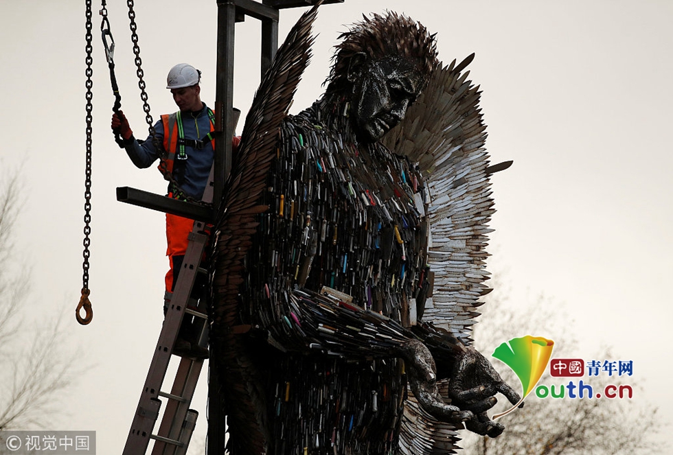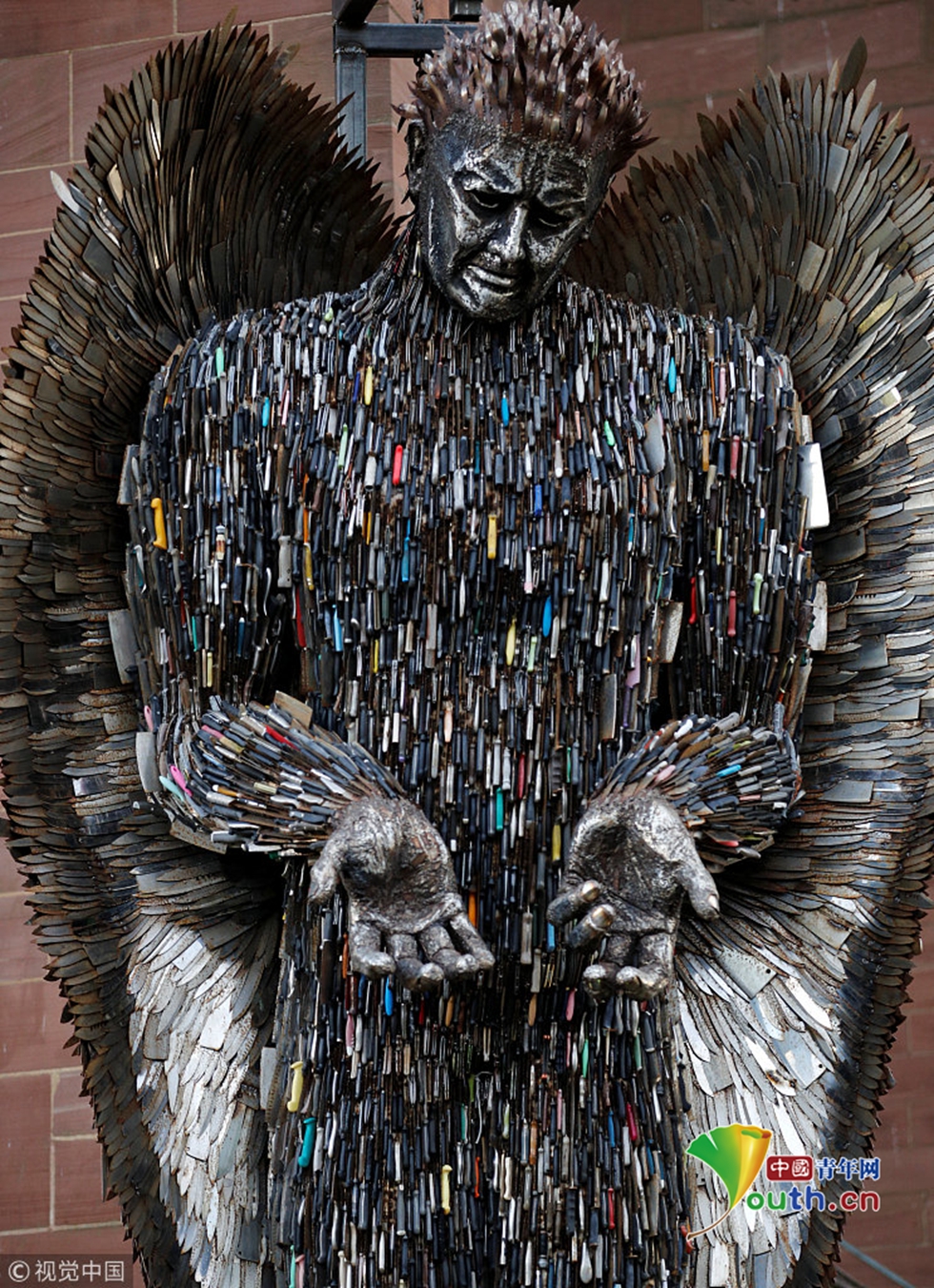 當(dāng)?shù)貢r(shí)間2018年11月29日,英國利物浦,藝術(shù)家阿爾菲·布拉德利在圣公會(huì)教堂外用沒收的10萬多把刀具制作了一尊名為“刀之天使”的塑像。