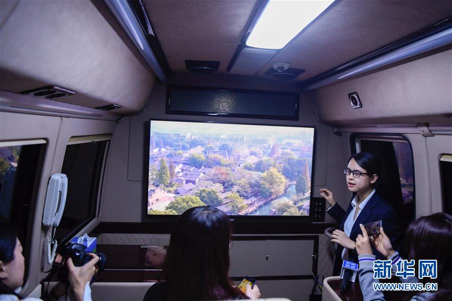 在浙江移動烏鎮(zhèn)分水墩營業(yè)廳外,工作人員在一輛體驗巴士內介紹通過5G移動傳輸技術實現的8K高清的視頻畫面實時展示(10月30日攝)。 新華社記者黃宗治攝