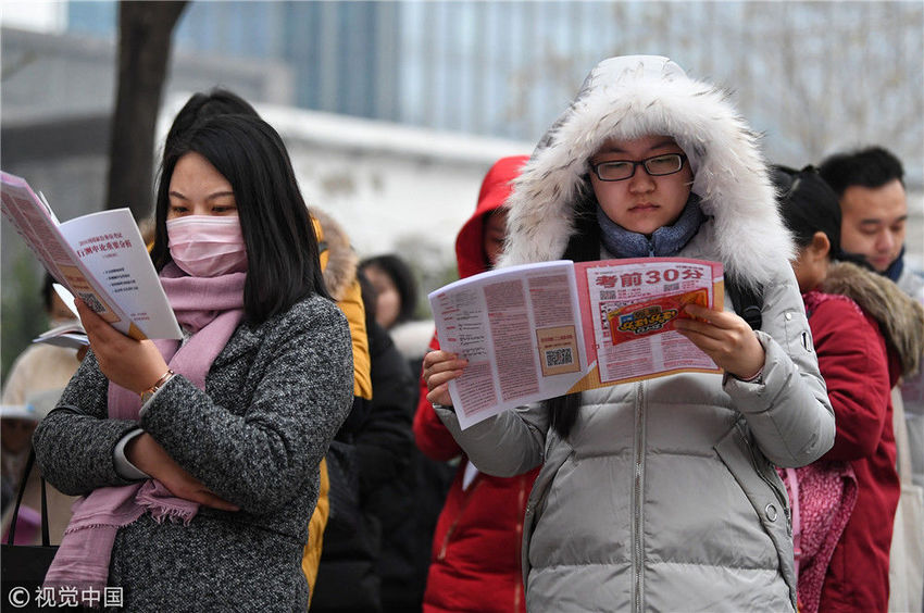 2018年12月2日,北京,參加2019年度中央機(jī)關(guān)及其直屬機(jī)構(gòu)公務(wù)員招考筆試的考生走入首都經(jīng)濟(jì)貿(mào)易大學(xué)考點(diǎn)準(zhǔn)備考試,步履匆匆。2019年度中央機(jī)關(guān)及其直屬機(jī)構(gòu)公務(wù)員招考筆試今日開考。本次國(guó)考計(jì)劃招錄1.45萬人,共有137.93萬人通過報(bào)名資格審查,平均競(jìng)爭(zhēng)比達(dá)到95:1,為近5年來最高,最熱崗位的競(jìng)爭(zhēng)超過4000:1。視覺中國(guó)
