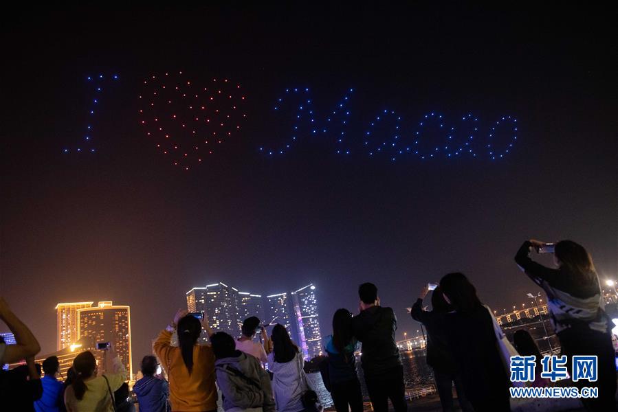 12月2日,無(wú)人機(jī)在澳門南灣湖水上活動(dòng)中心進(jìn)行空中圖案表演。 新華社記者 張金加 攝
