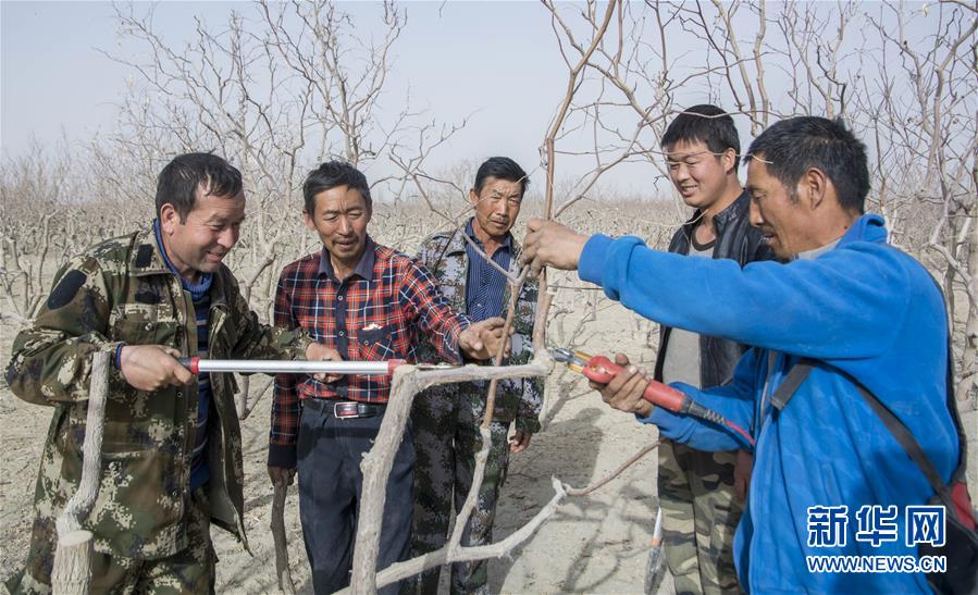 在拜什托格拉克鄉(xiāng)依提帕克吾斯唐村的棗地里,當(dāng)?shù)卮迕駥W(xué)習(xí)修剪棗樹枝條(3月19日攝)。 新華社發(fā)