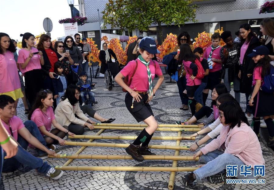 2018年6月16日,在葡萄牙阿威羅舉行的端午龍舟巡游活動開幕式上,阿威羅大學孔子學院的學生表演竹竿舞。 位于伊比利亞半島西南部的歐洲古國葡萄牙,山清水秀、風景如畫。它東、北連接西班牙,西、南瀕臨大西洋。葡萄牙現(xiàn)有人口1029.1萬,國土面積約9.22萬平方公里,首都為里斯本,官方語言為葡萄牙語。 新華社記者張立云攝
