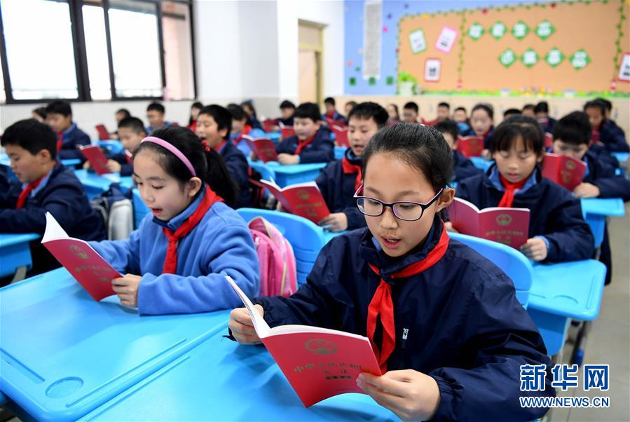 12月3日,合肥市朝霞小學(xué)的學(xué)生們?cè)谡b讀憲法。國家憲法日到來之際,各地學(xué)校紛紛舉辦主題宣講活動(dòng),對(duì)學(xué)生開展法治教育,幫助孩子們了解憲法知識(shí)。新華社記者 劉軍喜 攝