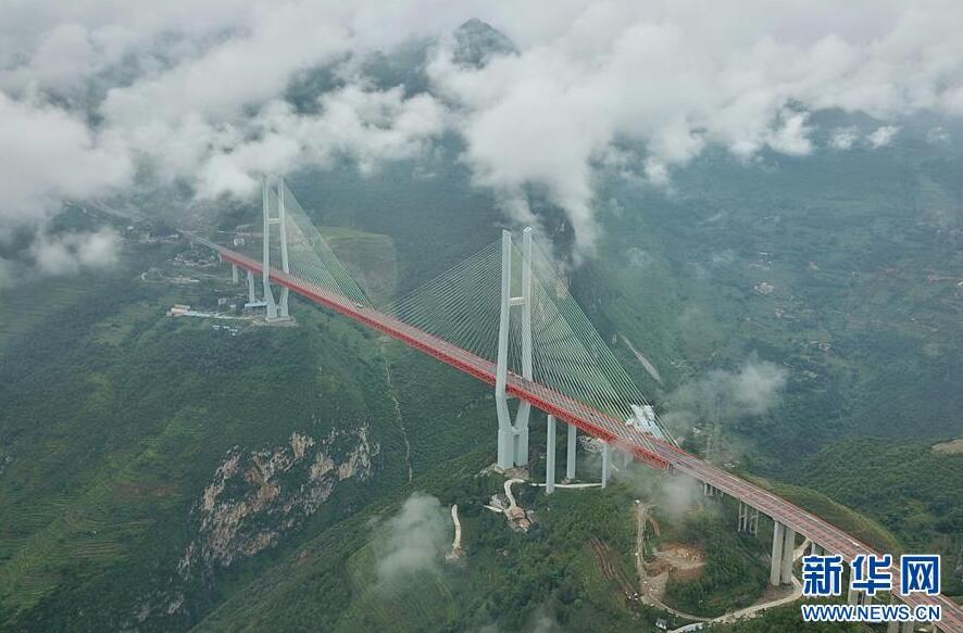 當日,杭瑞高速貴州省畢節(jié)至都格(黔滇界)公路北盤江大橋上云霧繚繞,美景如畫。北盤江大橋主橋跨徑720米,橋面到谷底垂直高度565米。