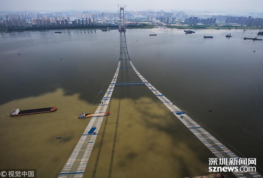 2018年5月14日,武漢,武漢楊泗港長江大橋上空,上部結構施工進入貓道面網(wǎng)鋪設階段,數(shù)十名中鐵大橋局工人在跨江高空拼搏趕超,江面上空的臨時“吊橋”悄然形成。數(shù)十名工人在長江上空228米處拼搏趕超,臨時“天梯”悄然形成。