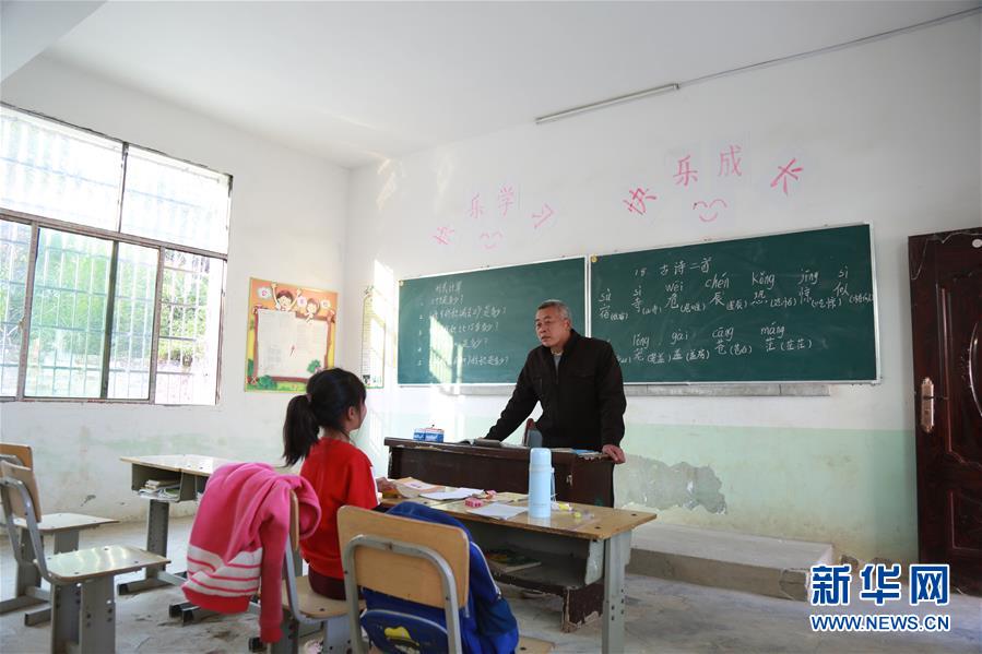 11月29日,在湖南省永州市冷水灘區(qū)黃陽(yáng)司鎮(zhèn)天里坪村小學(xué)教學(xué)點(diǎn),55歲的唐炳元在給7歲的陳宏薈上課,該教學(xué)點(diǎn)只有一名老師一名學(xué)生。 55歲的唐炳元已是滿頭白發(fā),他身后的墻壁上有兩塊黑板,一塊寫(xiě)著數(shù)學(xué)題,一塊寫(xiě)著漢字和拼音??帐幍慕淌覂?nèi),只擺有4張課桌。在今年上半年,班上還有4名學(xué)生,到下半年就只剩下1名了。
