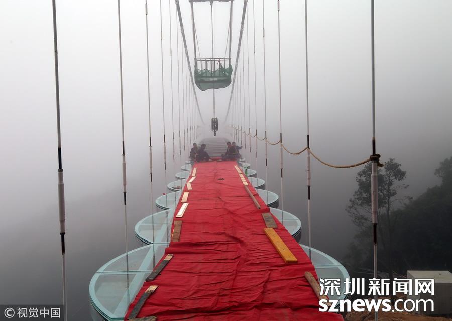 2018年12月3日,在浙江玉環(huán)市上棧頭玻璃吊橋建設(shè)工地上,工人們正在北端橋頭鋪設(shè)橋面4厘米厚的玻璃。