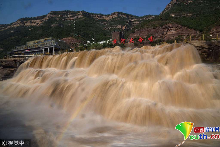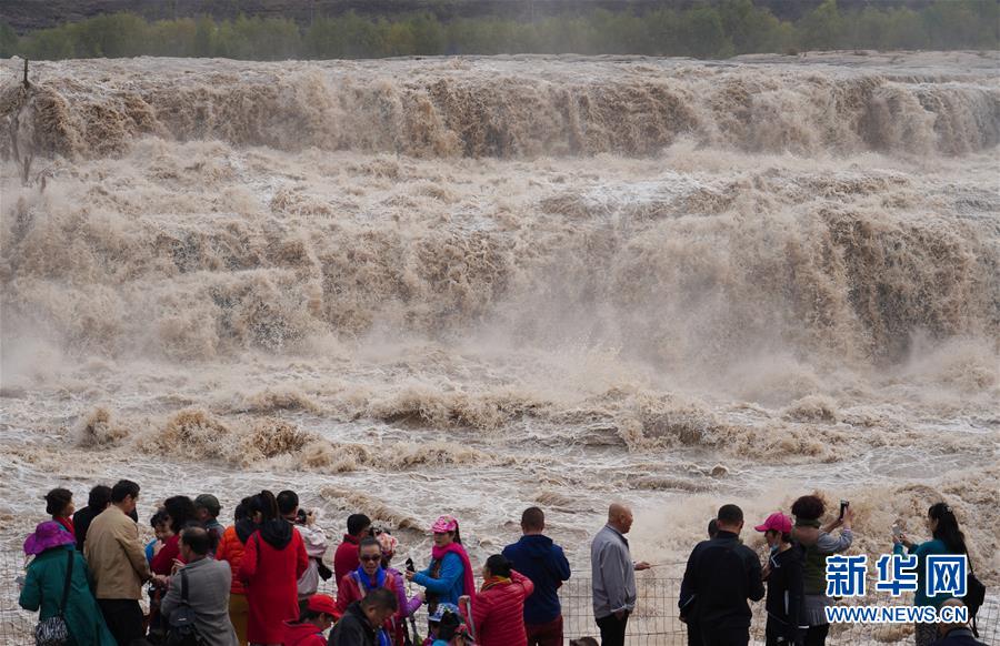 5月31日,山西臨汾奔騰咆哮的黃河壺口瀑布吸引游客。近日,受上游地區(qū)降雨量增多影響,黃河干流晉陜峽谷水量大增,每秒流量達(dá)到1100立方,是常年同期的三倍,壺口瀑布出現(xiàn)五月份罕見的瀑布群景觀,吸引了眾多游客。