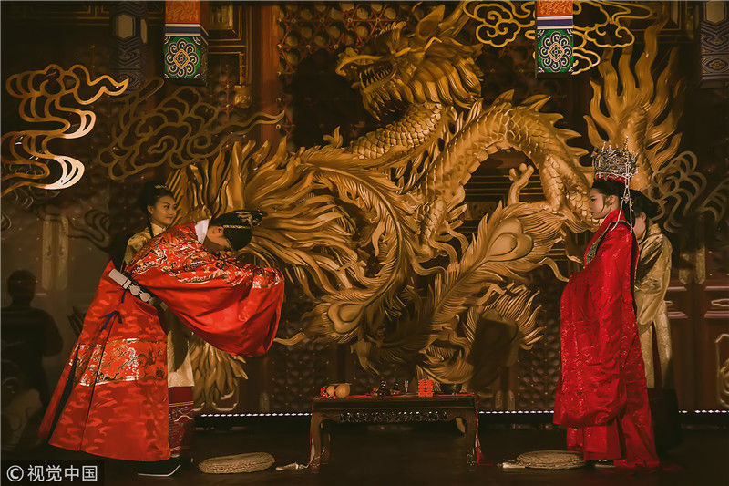 2018年11月18日,浙江嘉興?;槎Y開(kāi)始,隨著一聲“新婿、新婦正婚大典開(kāi)禮!掌燈!”兩名侍女提宮燈在前面開(kāi)道,兩名執(zhí)事手捧大雁跟隨,然后是新人緊隨。新人身后是兩侍女手持沃盥用具,兩執(zhí)事持裝肉的食盤(pán)、酒壺,走在最后面。