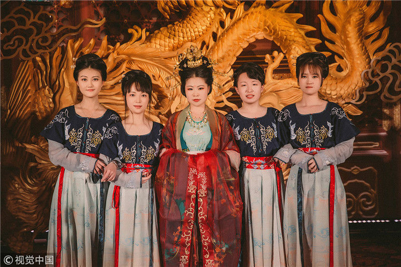 婚禮開始,隨著一聲“新婿、新婦正婚大典開禮!掌燈!”兩名侍女提宮燈在前面開道,兩名執(zhí)事手捧大雁跟隨,然后是新人緊隨。新人身后是兩侍女手持沃盥用具,兩執(zhí)事持裝肉的食盤、酒壺,走在最后面。圖為在婚禮上,這些小姐妹都穿上漢服,像一個個漂亮的宮女。